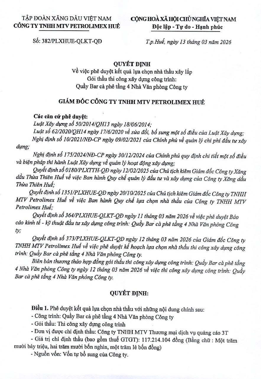 Kết quả lựa chọn nhà thầu xây lắp Gói thầu thi công xây dựng công trình: Quầy Bar cà phê tầng 4 Nhà Văn phòng Công ty