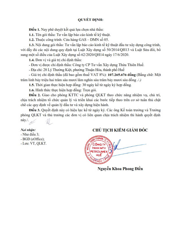 Phê duyệt kết quả lựa chọn nhà thầu Gói thầu: Tư vấn lập báo cáo kinh tế kỹ thuật thuộc Công trình: Cửa hàng GAS – DMN số 05